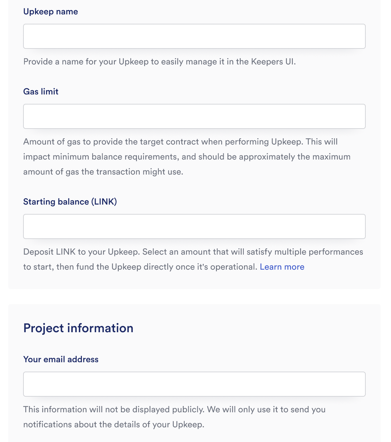 - Starting balance (LINK): Specify a LINK starting balance to fund your upkeep. See the LINK Token Contracts page to find the correct contract address and access faucets for testnet LINK. This field is required. You must have LINK before you can use the Chainlink Automation service.