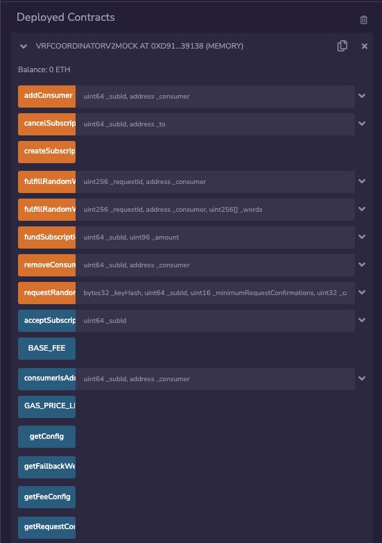 1. Under Deployed Contracts, open the functions list of your deployed VRFCoordinatorV2Mock contract.