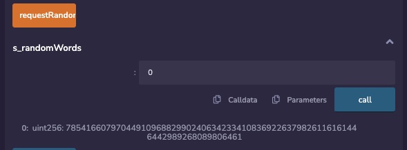 3. Each time you make a VRF request, your consumer contract requests two random words. After the request is fulfilled, the two random words are stored in the s_randomWords array. You can check the stored random words by reading the two first indexes of the s_randomWords array. To do so, click on the s_randomWords function and:
