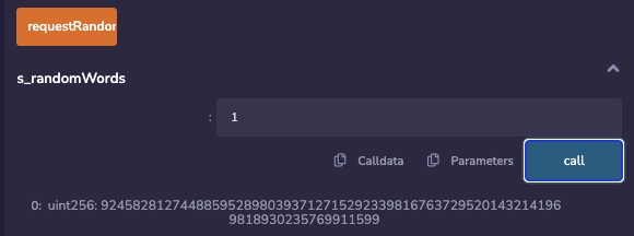 2. Click fulfillRandomWords and fill in _requestId with your VRF request ID and _consumer with your consumer contract address.